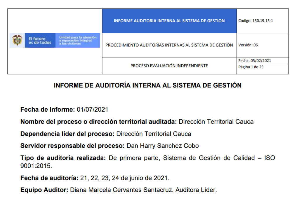 Informe Auditoria de Calidad – DT Cauca